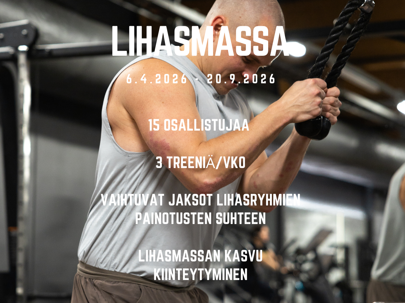 Lihasmassavalmennuksessa harjoitetaan monipuolisesti eri lihasryhmiä, joissa 4-8 viikon välein lihasryhmäkohtaiset painotukset muuttuvat. Valmennuksessa opit kehittävän lihasmassaharjoittelun pääperiaatteet ja saat laadukasta harjoittelun ohjelmointia. Sinulle jää tehtäväksi vain toteuttaa harjoitukset, jotka löytyvät harjoitusohjelmasovelluksesta. Etätapaamisten aikana käymme läpi keskeisiä harjoitteluun vaikuttavia aiheita.