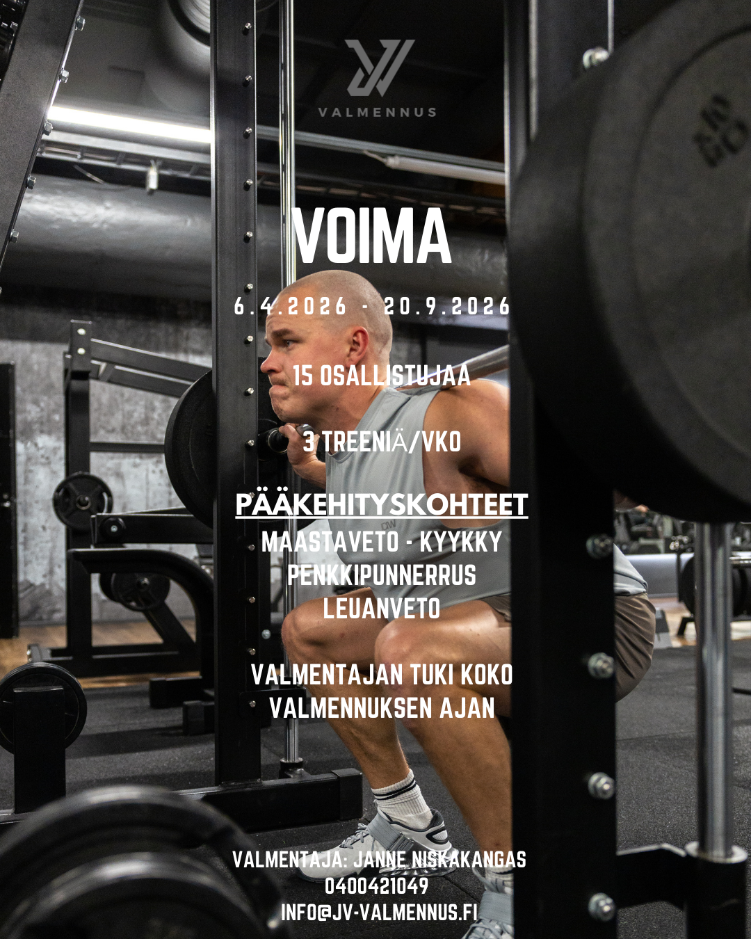 Voimavalmennuksessa kehittymisen keskiössä ovat voimannostoliikkeissä (penkkipunnerrus, maastaveto, kyykky) edistyminen. Harjoittelu on nousujohteista päätavoitteen osalta ja huolehdin myös, että tukilihasryhmiä kehitetään myös monipuolisesti voimatasojen noustessa. Valmennuksessa opit kuinka voimatasoja kehitetään turvallisesti nousujohteisen ja monipuolisen harjoittelun avulla.