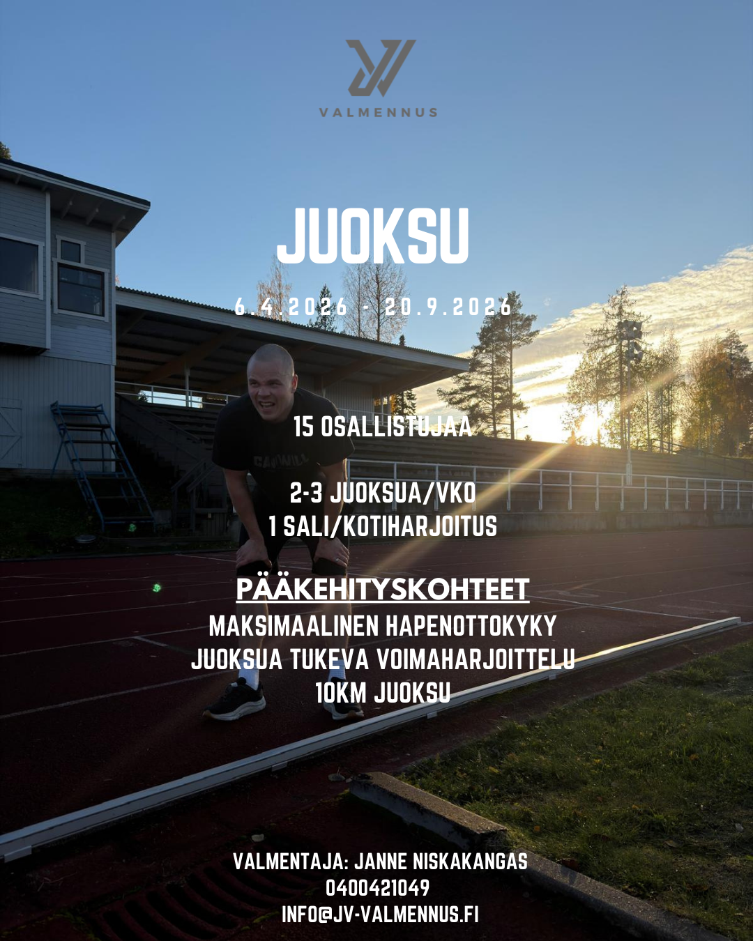 Juoksuvalmennuksen tavoitteena on, että opit nousujohteisen kestävyysharjoittelun lainalaisuuksia sekä saat kokea millaista kehittävä harjoittelu on aerobisen kunnon osalta. Lisäksi valmennukseen kuuluu juoksua tukevaa lihasvoimaharjoittelua, jonka voit toteuttaa kotona tai salilla 1 krt/vko. Valmennuksessa keskitytään 10 km juoksumatkassa kehittymiseen ja kuormitus määritetään sykealueiden tai koetun rasituksen mukaisesti.